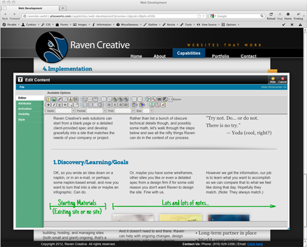 Raven can help you select and implement one of the many CMS solutions available, including open-source options. We'll find you one that is completely Web-based and uses a simple interface that can be learned in minutes. It must cater to power users and programmers alike, featuring source code editing capabilities and several add-on modules to boost the feature set.